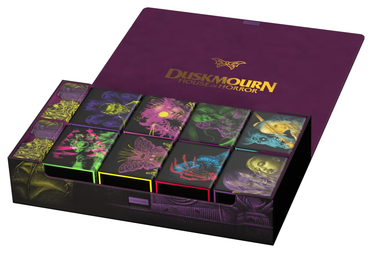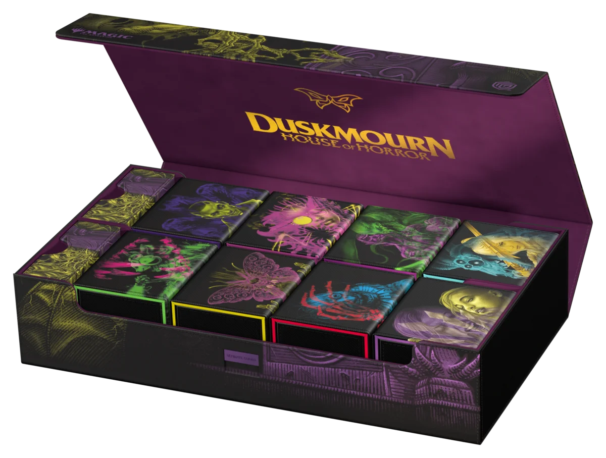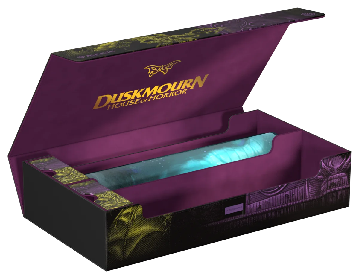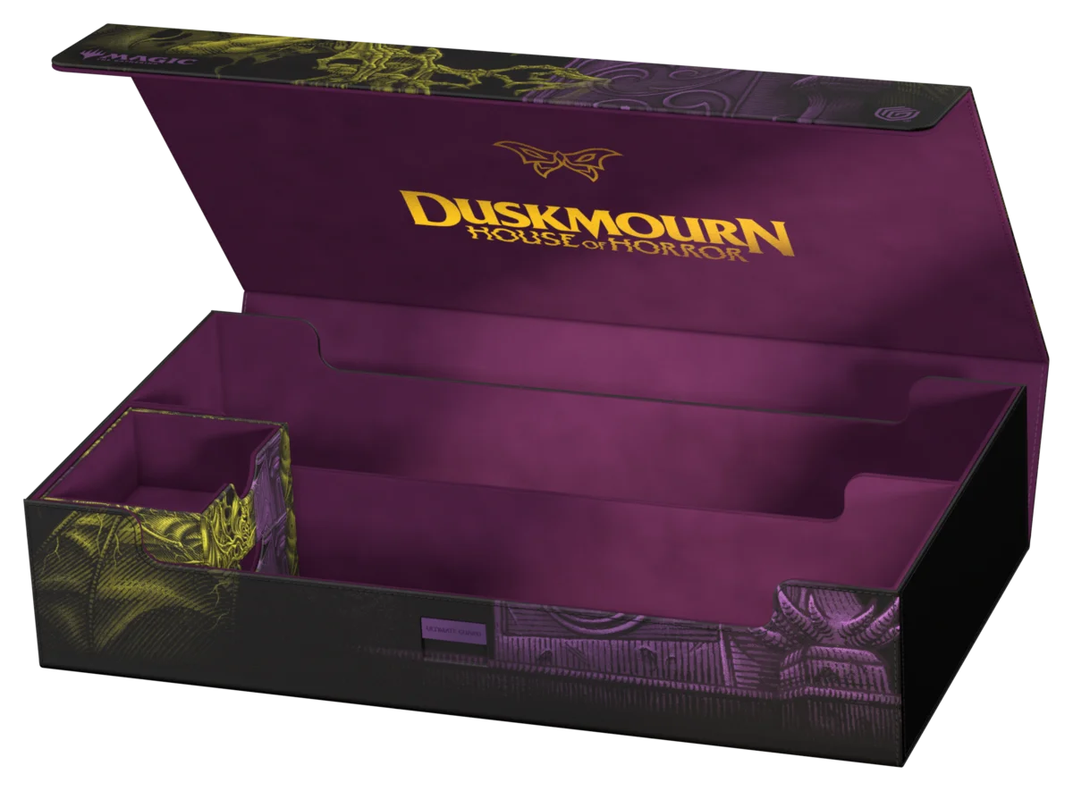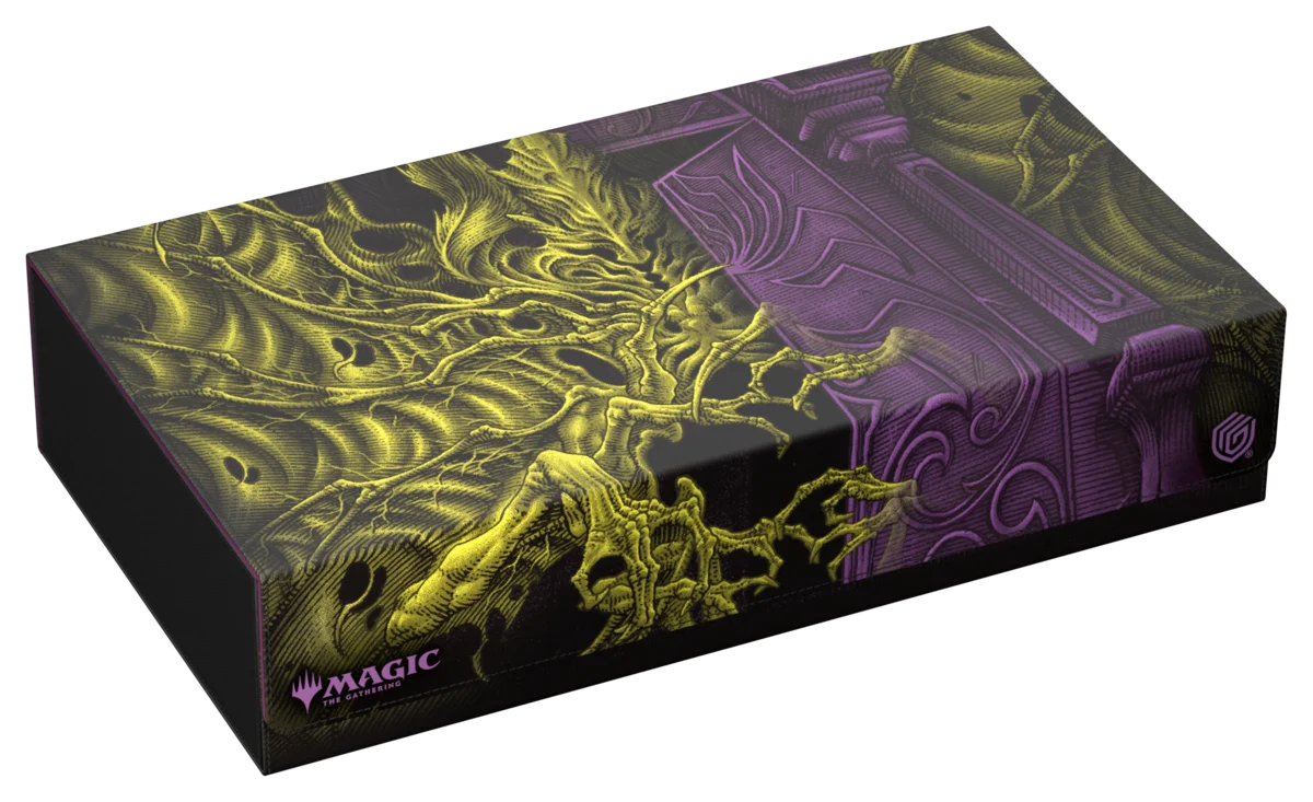 Valgavoth sucht nicht nur The House heim, sondern wacht auch über den Ultimate Guard Omnihive 1000+ Xenoskin zu Magic: The Gatherings neuem Set Duskmourn: House of Horror. Im Omnihive finden mehrere Deck-Boxen und/oder Play-Mats Platz, alternativ können dort über 1000 einzelne Karten (double-sleeved) aufbewahrt und transportiert werden. Die zwei flexibel positionierbaren, magnetischen Fächer sind perfekt geeignet, um Würfel und Tokens aufzubewahren. Die Deck-Box aus widerstandsfähigem Xenoskin-Material zeigt das offiziell lizensierte Magic: The Gathering-Artwork zu Valgavoth, Terror Eater von Illustrator Pig Hands. Die hochwertige und stylische Mikrofaser-Innenseite, ein starker Magnetverschluss sowie unser ZnapClaw-Mechanismus sorgen dafür, dass alle Inhalte des Omnihive sicher verstaut sind. Zum Beispiel die Sidewinder 100+ Xenoskin-Deck-Boxen im gleichen Stil aus unserer Duskmourn: House of Horror-Serie!