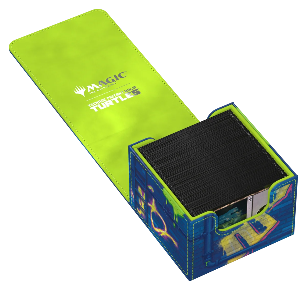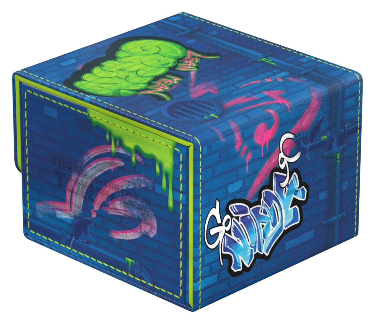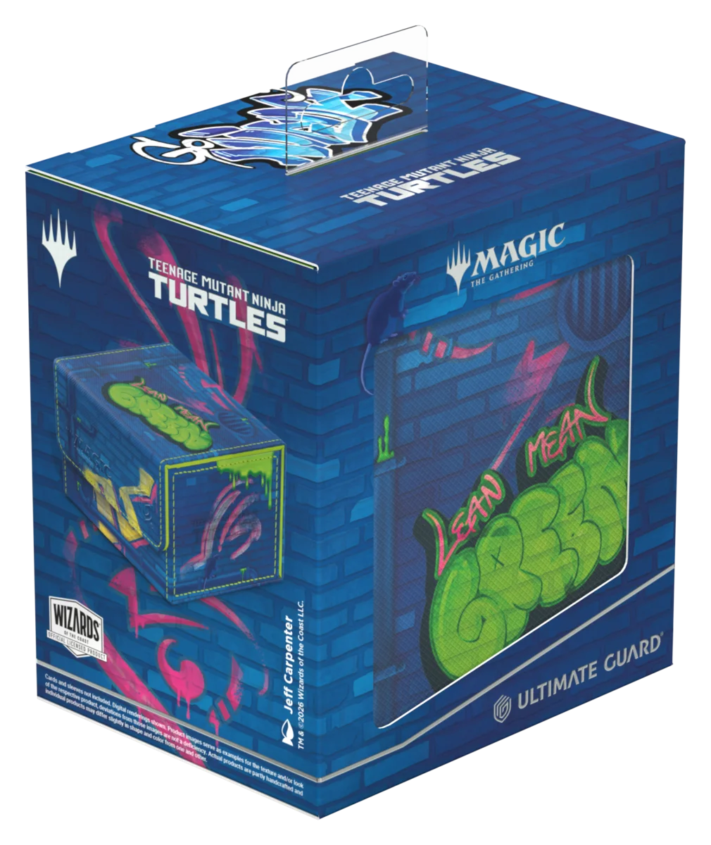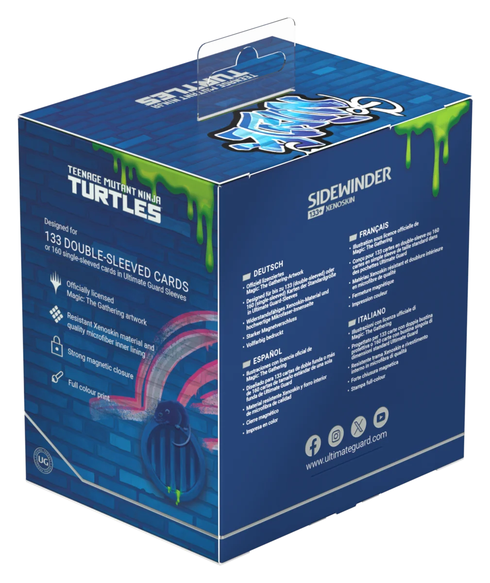 Ultimate Guard's Sidewinder 133+ Xenoskin is a premium Magic: The Gathering deck box offering exceptional card protection with its durable Xenoskin material, microfiber inner lining, and strong magnetic closure—all while providing easy and convenient access to the cards inside. With space for 133 double-sleeved cards in Ultimate Guard sleeves* and printed with officially licensed artwork from the "Magic: The Gathering | Teenage Mutant Ninja Turtles" set, the Sidewinder 133+ Xenoskin is the ideal MTG deck box for Commander/EDH, offering extra space for additional cards and tokens. Designed to combine with Ultimate Guard's Omnihive, Superhive, and Smarthive mass storage boxes.