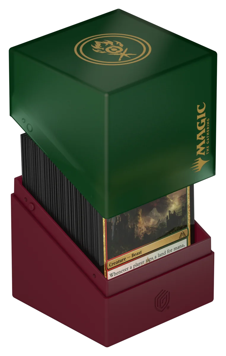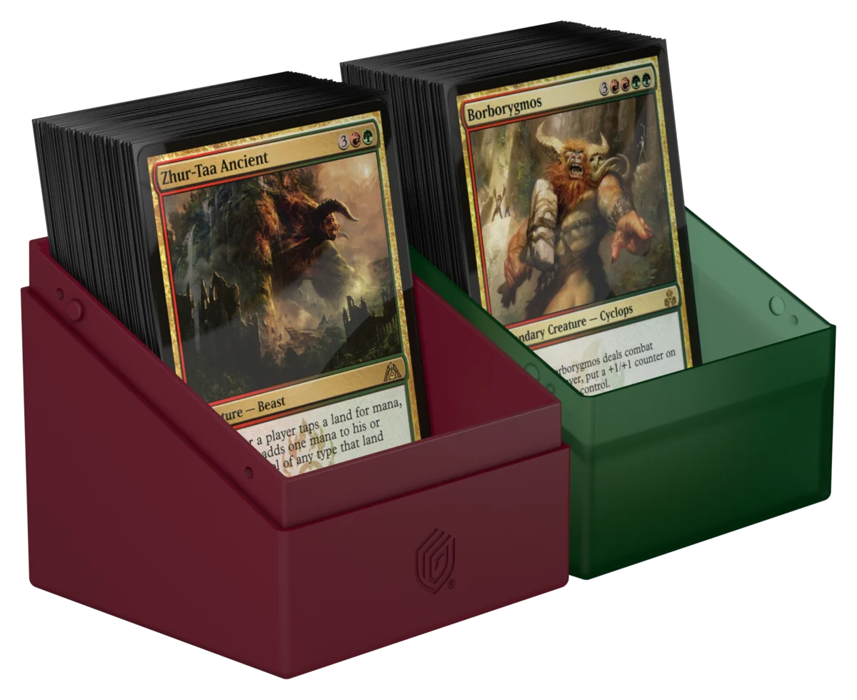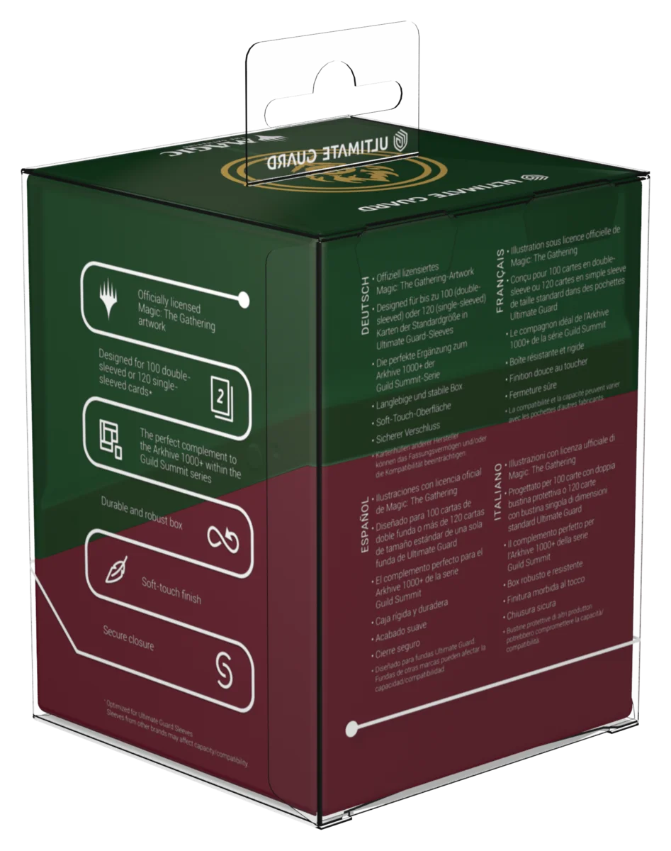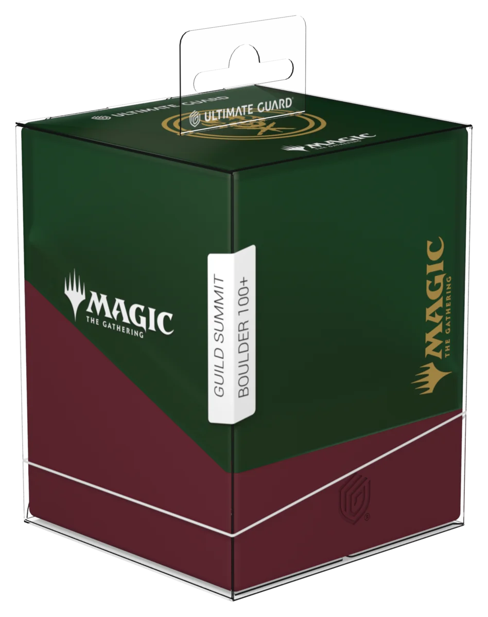 Ultimate Guard celebrates one of the most iconic and popular planes in Magic: The Gathering's history with the "Guild Summit" series: Ten elegant Boulder 100+ featuring the golden crest of each guild on the semi-transparent deck boxes, all with a silky soft-touch finish. The Boulder 100+ holds up to 100 double-sleeved cards, making it the perfect home for your two-color Commander deck! Don't miss out on the stunning Arkhive 1000+ Xenoskin from the "Guild Summit" series either, which is the perfect storage place for up to ten Boulder 100+.
