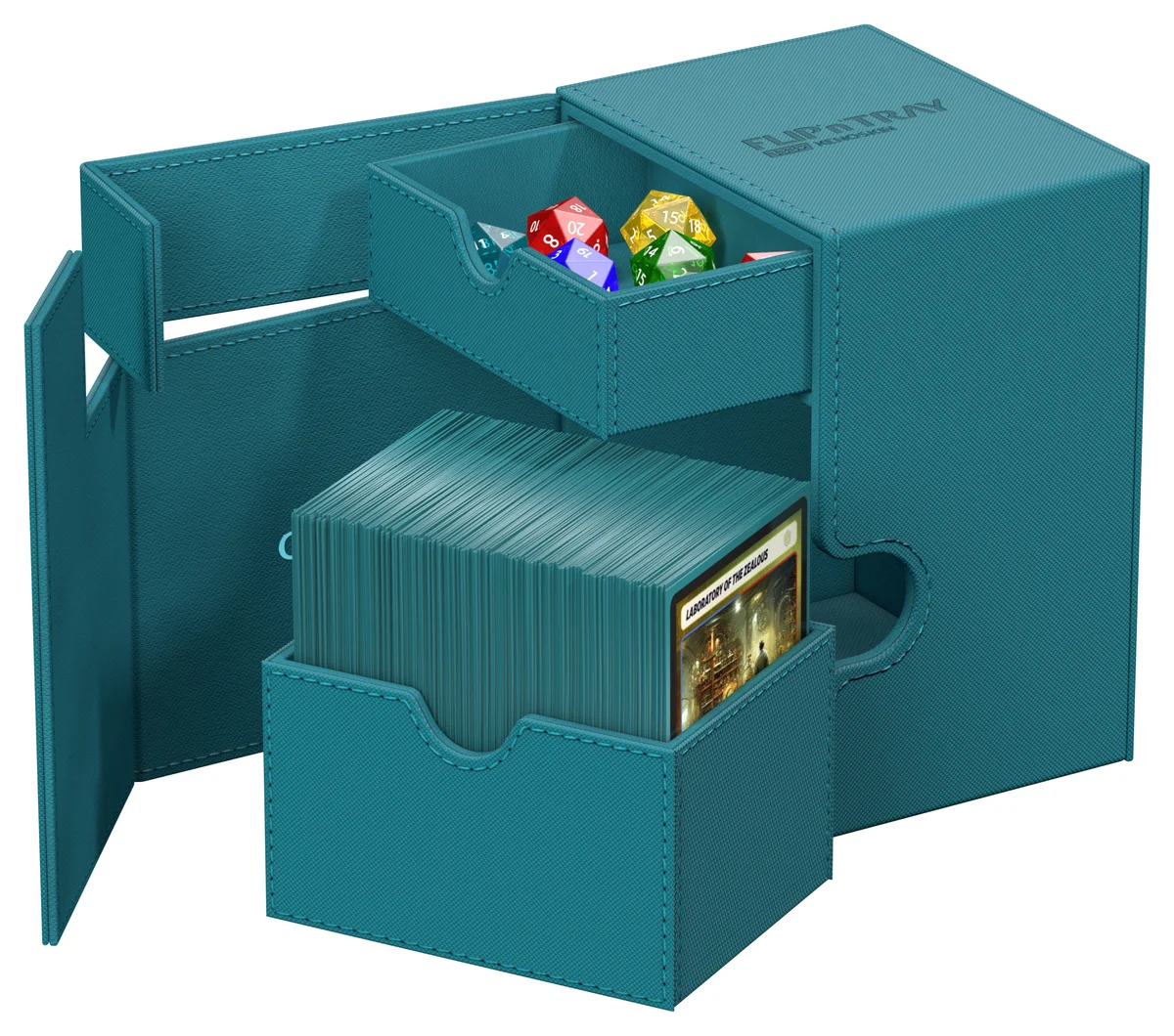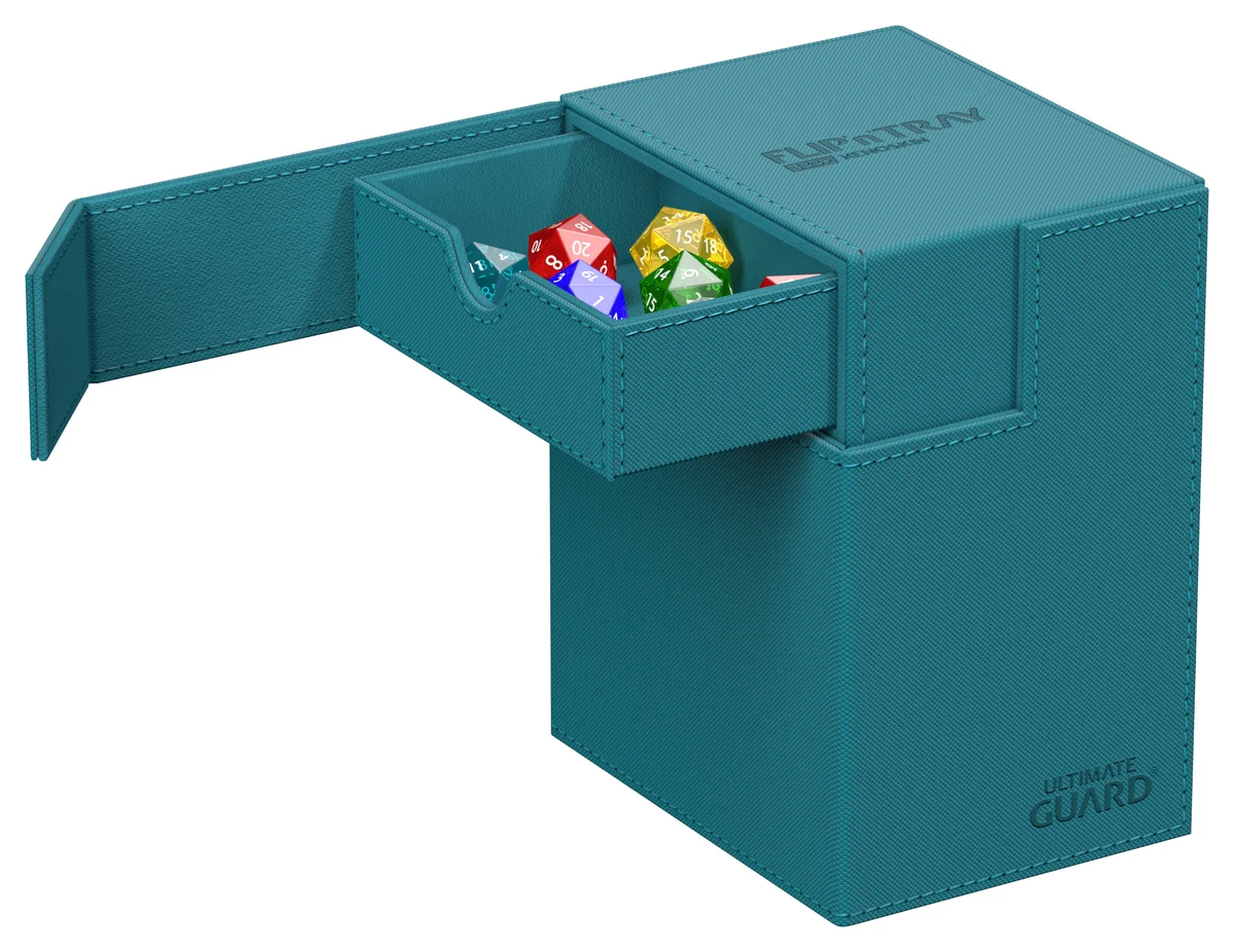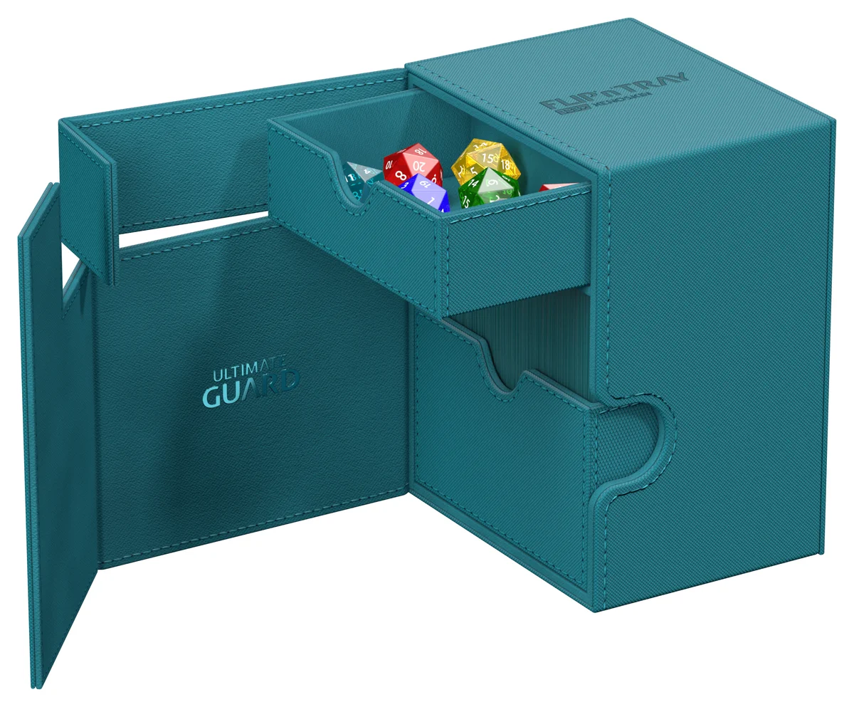 The latest version of Ultimate Guard's legendary Flip'n'Tray offers even more space: The Flip'n'Tray 133+ Xenoskin fits up to 133 double-sleeved cards, thanks to the integrated extra compartment for dice, the deck box is perfect for Commander/EDH decks and is the optimal companion for Magic: The Gathering players at Limited Events. But fans of other TCGs like Pokémon or Flesh and Blood will also love the spacious and practical deck box with our proven Xenoskin surface!