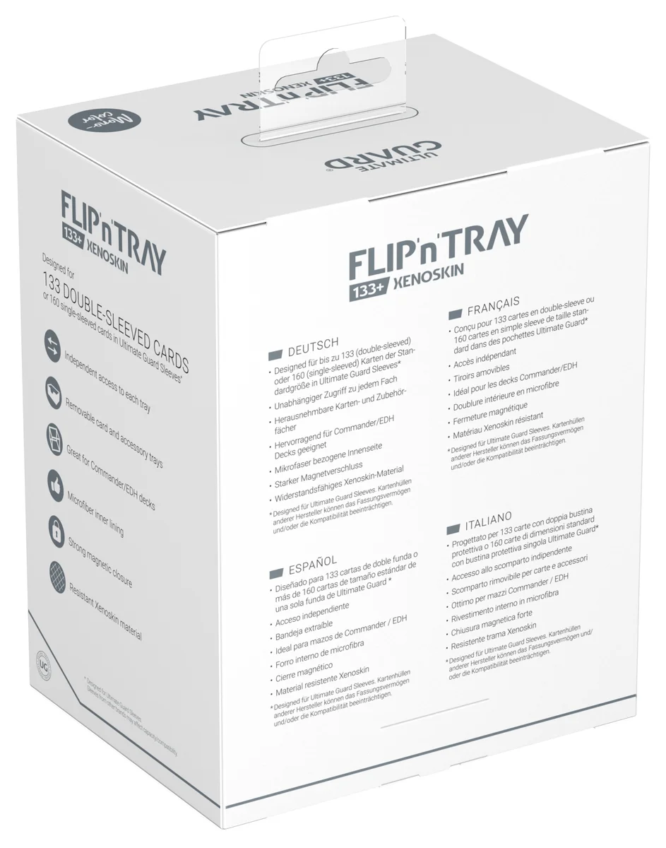 The latest version of Ultimate Guard's legendary Flip'n'Tray offers even more space: The Flip'n'Tray 133+ Xenoskin fits up to 133 double-sleeved cards, thanks to the integrated extra compartment for dice, the deck box is perfect for Commander/EDH decks and is the optimal companion for Magic: The Gathering players at Limited Events. But fans of other TCGs like Pokémon or Flesh and Blood will also love the spacious and practical deck box with our proven Xenoskin surface!
