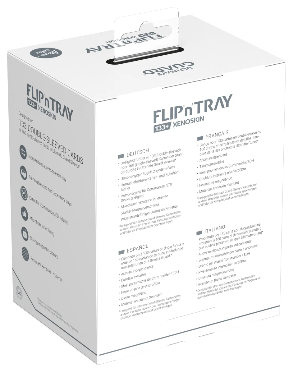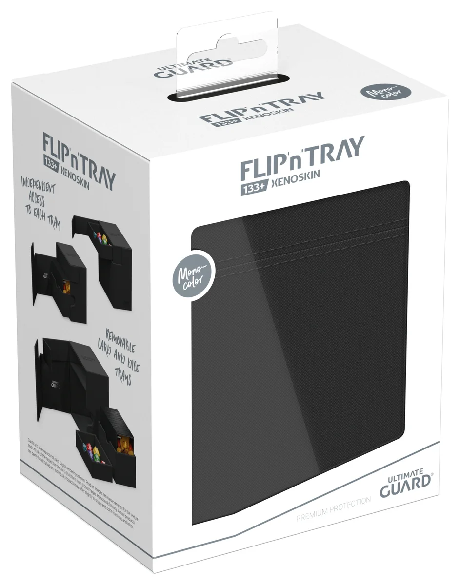 The latest version of Ultimate Guard's legendary Flip'n'Tray offers even more space: The Flip'n'Tray 133+ Xenoskin fits up to 133 double-sleeved cards, thanks to the integrated extra compartment for dice, the deck box is perfect for Commander/EDH decks and is the optimal companion for Magic: The Gathering players at Limited Events. But fans of other TCGs like Pokémon or Flesh and Blood will also love the spacious and practical deck box with our proven Xenoskin surface!