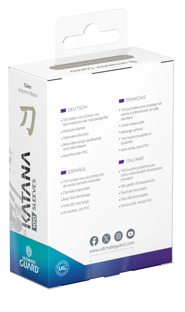 Las Katana Sleeves de Ultimate Guard son fundas de alta calidad para cartas TCG, reconocidas por su durabilidad y sensación de barajado inigualable. Diseñadas para cartas de tamaño estándar (Magic: The Gathering, Pokémon, Lorcana, One Piece, Flesh and Blood, entre otras), ofrecen una claridad impecable en la parte frontal y un reverso opaco que garantiza la máxima protección y uniformidad. Cumplen con los estándares más exigentes de juego competitivo, ideales incluso para torneos extensos de alto nivel.