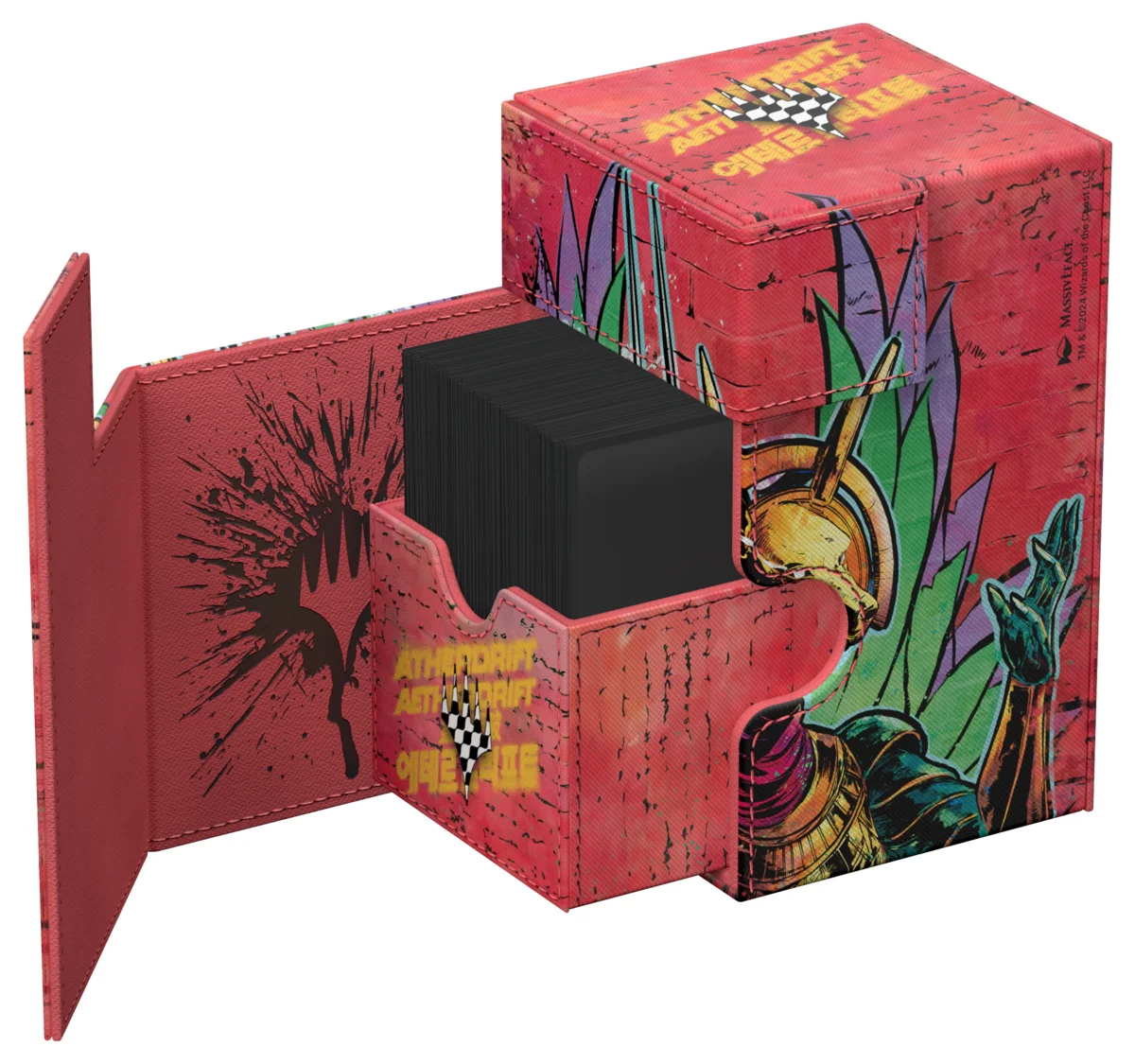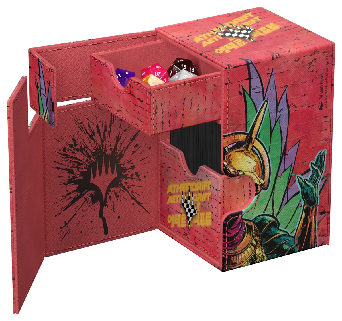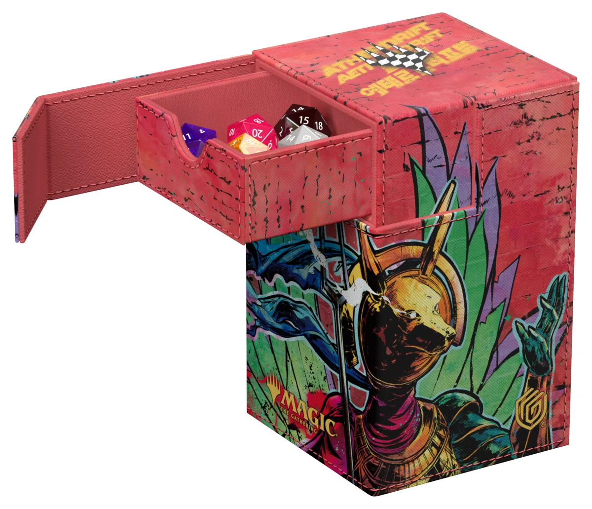 El Flip'n'Tray 100+ Xenoskin de Ultimate Guard se encuentra por primera vez con ilustraciones con licencia oficial de Magic: The Gathering: La caja de mazo estilo Aetherdrift hecha de material Xenoskin resistente e impreso a todo color no sólo ofrece espacio para 100 cartas de doble funda (120 de sola funda), sino también una bandeja de dados integrada y extraíble. La Flip'n'Tray 100+ Xenoskin cuenta con cierres magnéticos fiables y resistentes para guardar de forma segura los mazos y accesorios de TCG.
