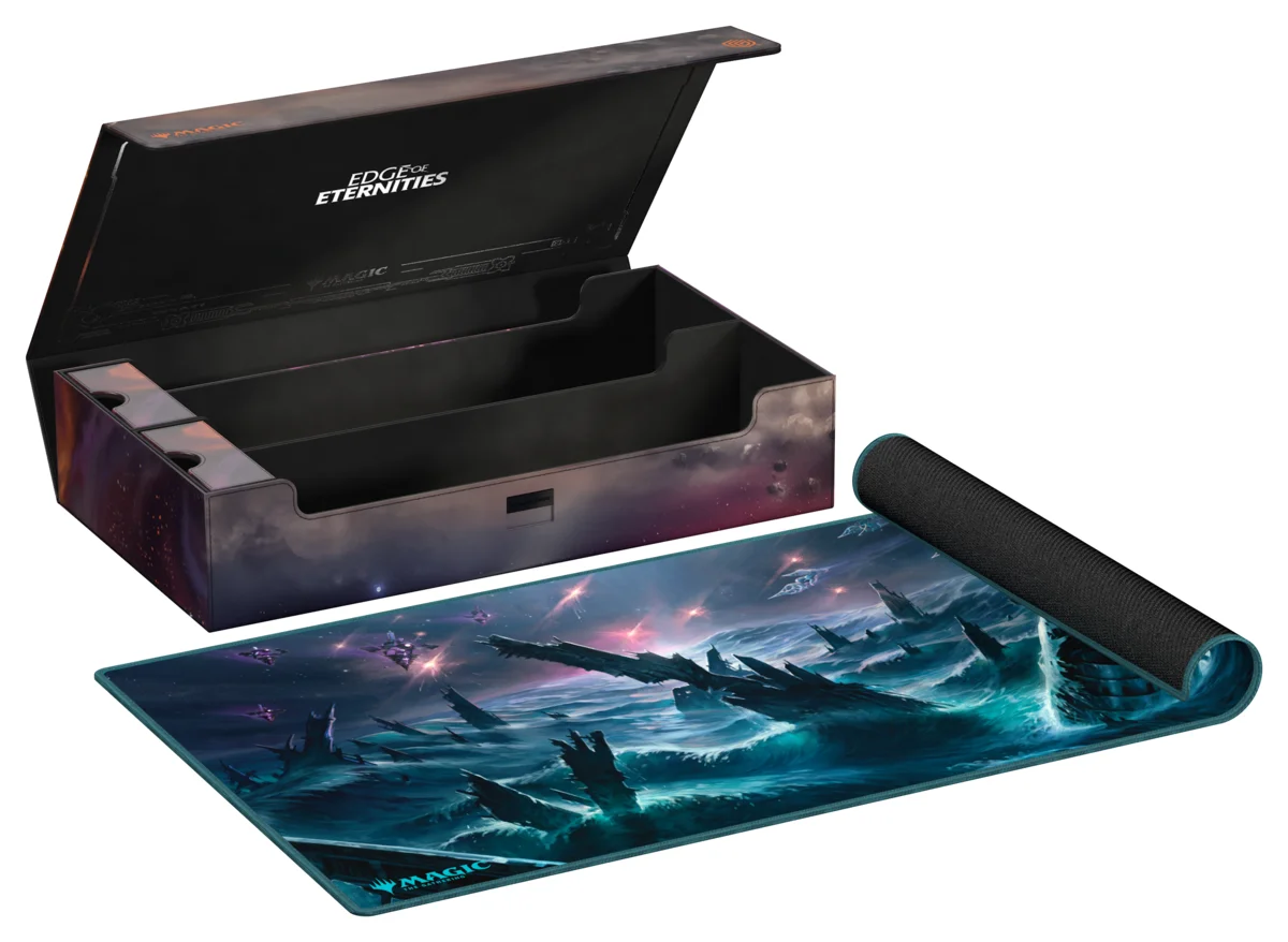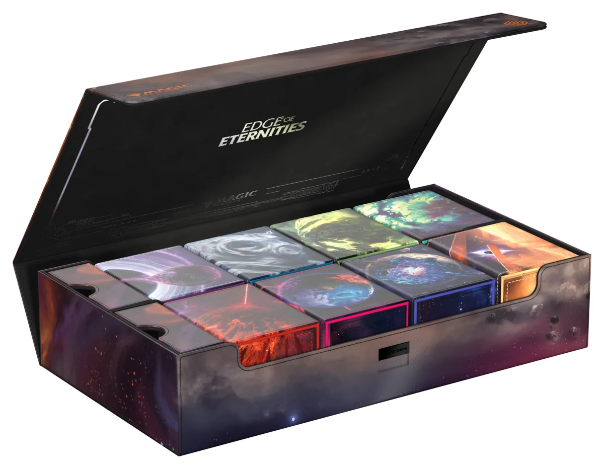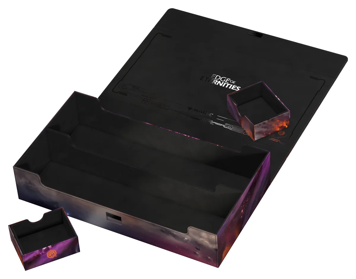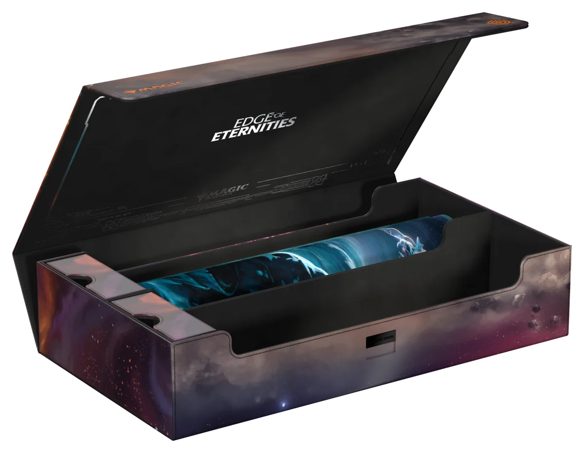 El Omnihive 1000+ Xenoskin, con ilustración oficial licenciada de Magic: The Gathering "Edge of Eternities", es una caja de almacenamiento masivo diseñada para contener varias cajas del mazo, dados y/o playmats a la vez — o alternativamente una gran colección de cartas sueltas (hasta 1000 cartas doble sleeve). Las dos bandejas magnéticas prácticas y flexibles en el interior, al igual que el exterior de la caja, están hechas de material Xenoskin resistente e impreso a todo color y cuentan con un forro interior de microfibra de calidad. La tapa del Omnihive 1000+ Xenoskin se asegura con potentes imanes y un mecanismo adicional ZnapClaw.