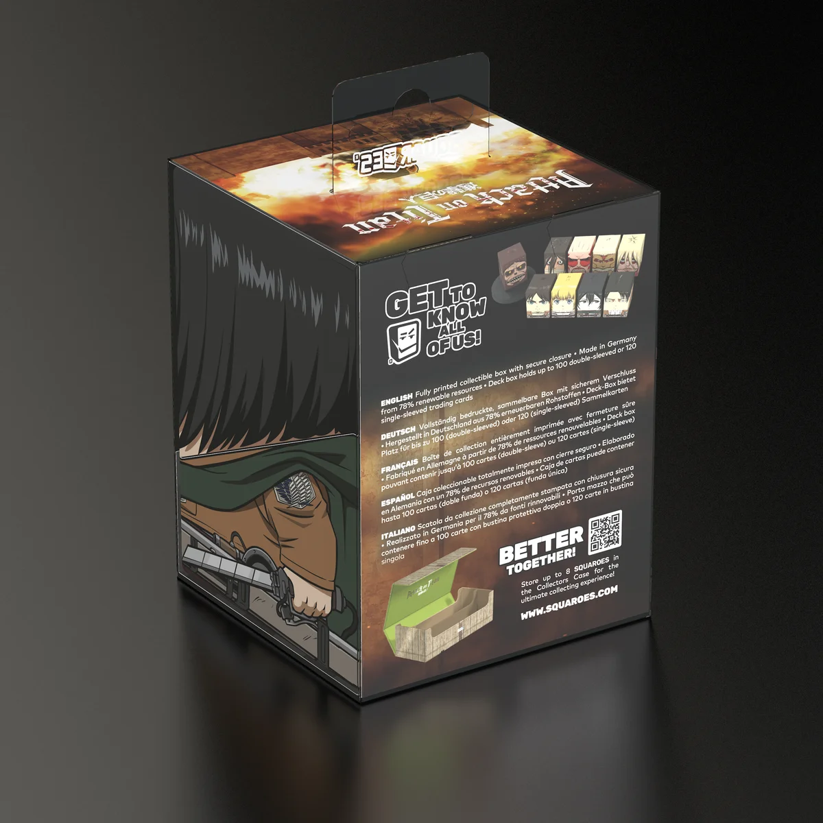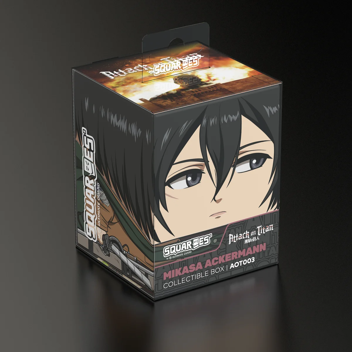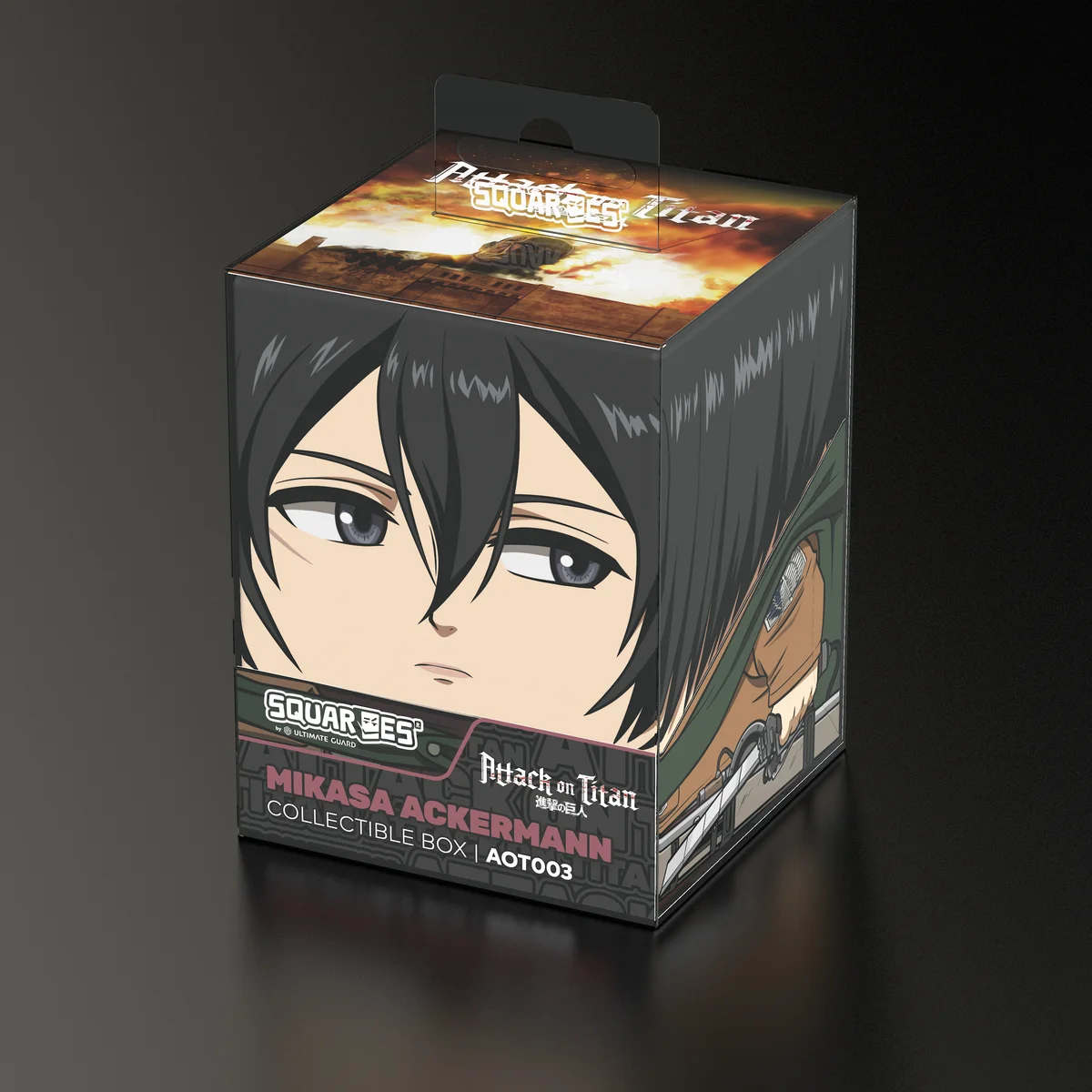 Caja coleccionable para almacenar mazos de TCG, accesorios de juegos de mesa y/o objetos de colección. El Mikasa Ackermann Squaroe de la edición Attack on Titan puede contener hasta 100 cartas con fundas dobles si se usa como caja de mazo. Los Squaroes están hechos con un 78% de recursos renovables y se adaptan perfectamente en el Collectors Case disponible por separado.