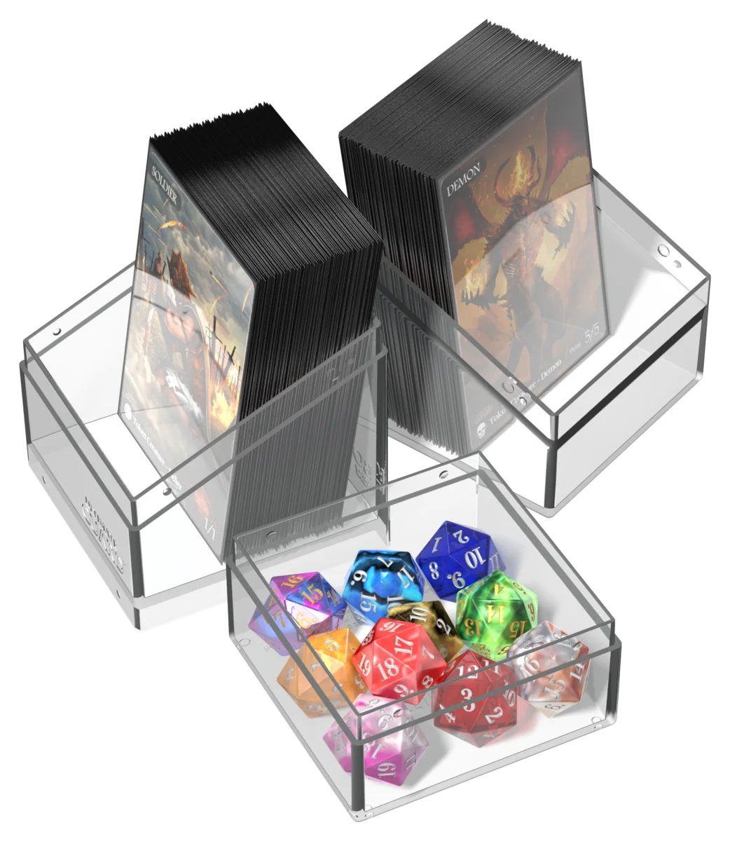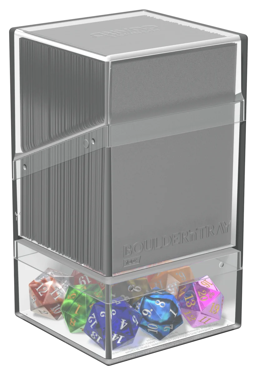A la demande générale, voici le Boulder'n'Tray 100+. Cette deck case combine la robustesse de notre Boulder avec la flexibilité d'un compartiment supplémentaire pour vos dés et autres accessoires - comme c'était le cas pour notre classique Monolith. Notre Boulder'n'Tray 100+ impressionne par sa finition durable et douce au toucher², qui assure une prise en main confortable et une longue durée de vie pendant toutes vos sessions de jeu.