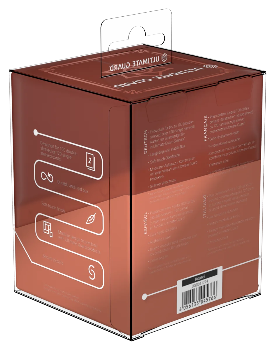 Le Boulder 100+ de la série « Katana: The Shogun’s Journey » d’Ultimate Guard est une deck box durable et fiable avec notre populaire surface soft-touch. Malgré sa fermeture sécurisée, le Boulder 100+ s’ouvre facilement et offre une capacité de 100 cartes en double sleeve dans des pochettes Ultimate Guard* issues de jeux de cartes à collectionner tels que Magic: The Gathering, Pokémon, Lorcana, Flesh and Blood, Yu-Gi-Oh! et One Piece. Conçu pour se combiner avec toutes les boîtes de rangement pour decks d’Ultimate Guard, ces Boulder 100+ s’intègrent parfaitement dans l’Arkhive 400+ Xenoskin de la même série.