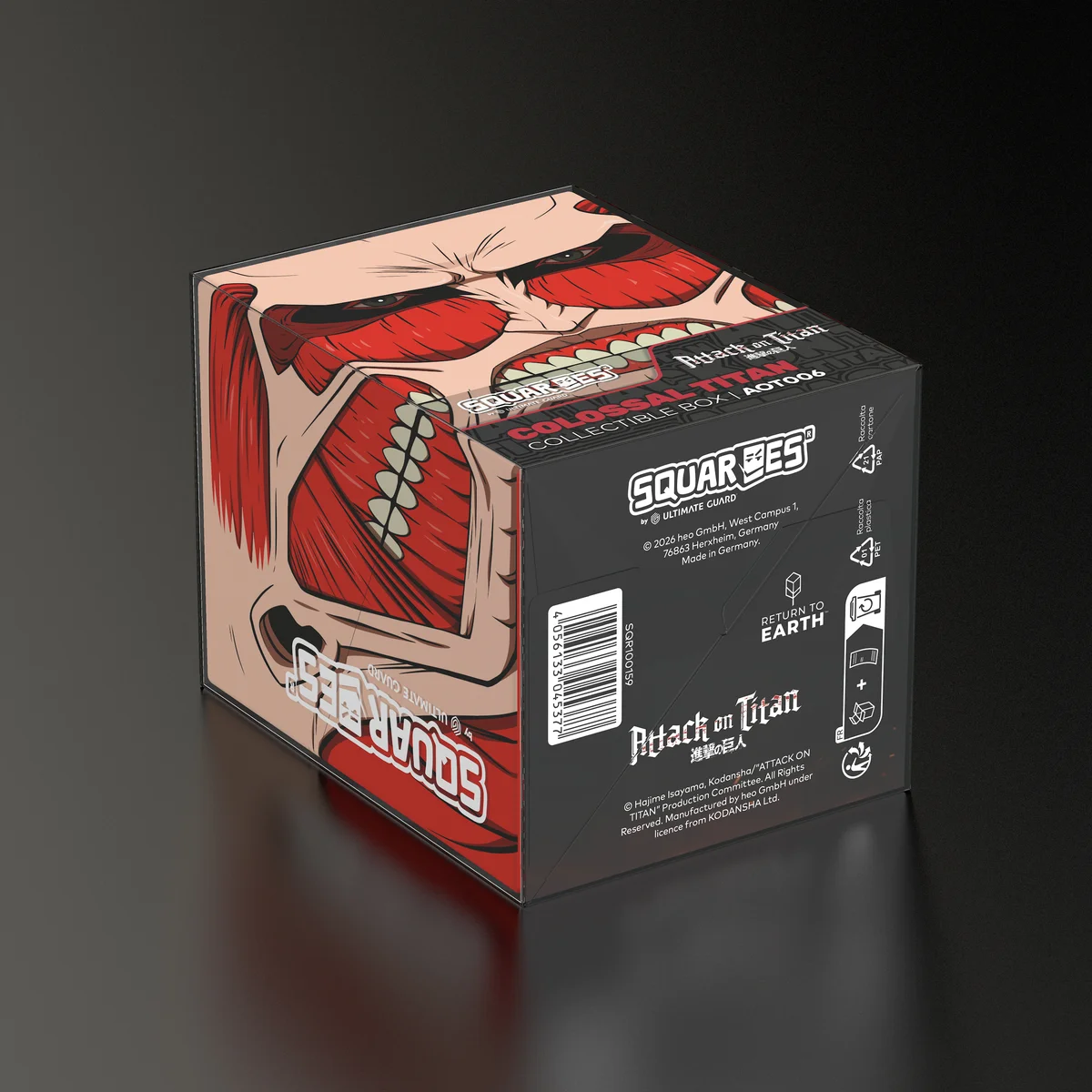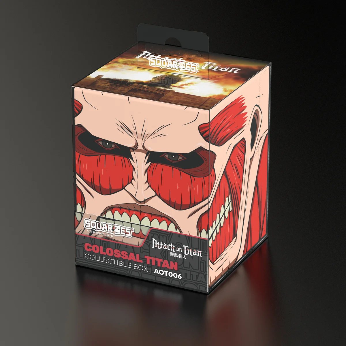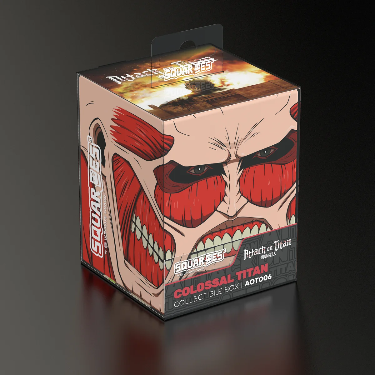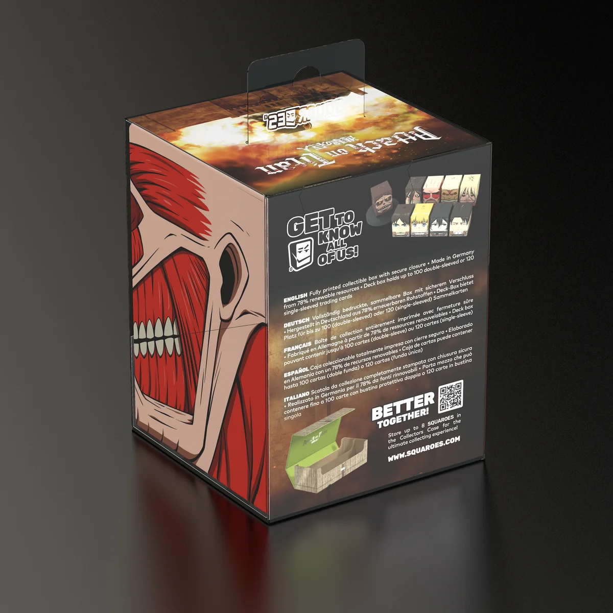 Boîte de collection pour ranger des decks de TCG, des accessoires de jeux de plateau et/ou des objets de collection. Le Colossal Titan Squaroe de l'édition Attack on Titan peut contenir jusqu'à 100 cartes en double sleeve lorsqu'il est utilisé comme deck box. Les Squaroes sont fabriqués à partir de 78 % de ressources renouvelables et s'adaptent parfaitement dans le Collectors Case disponible séparément.