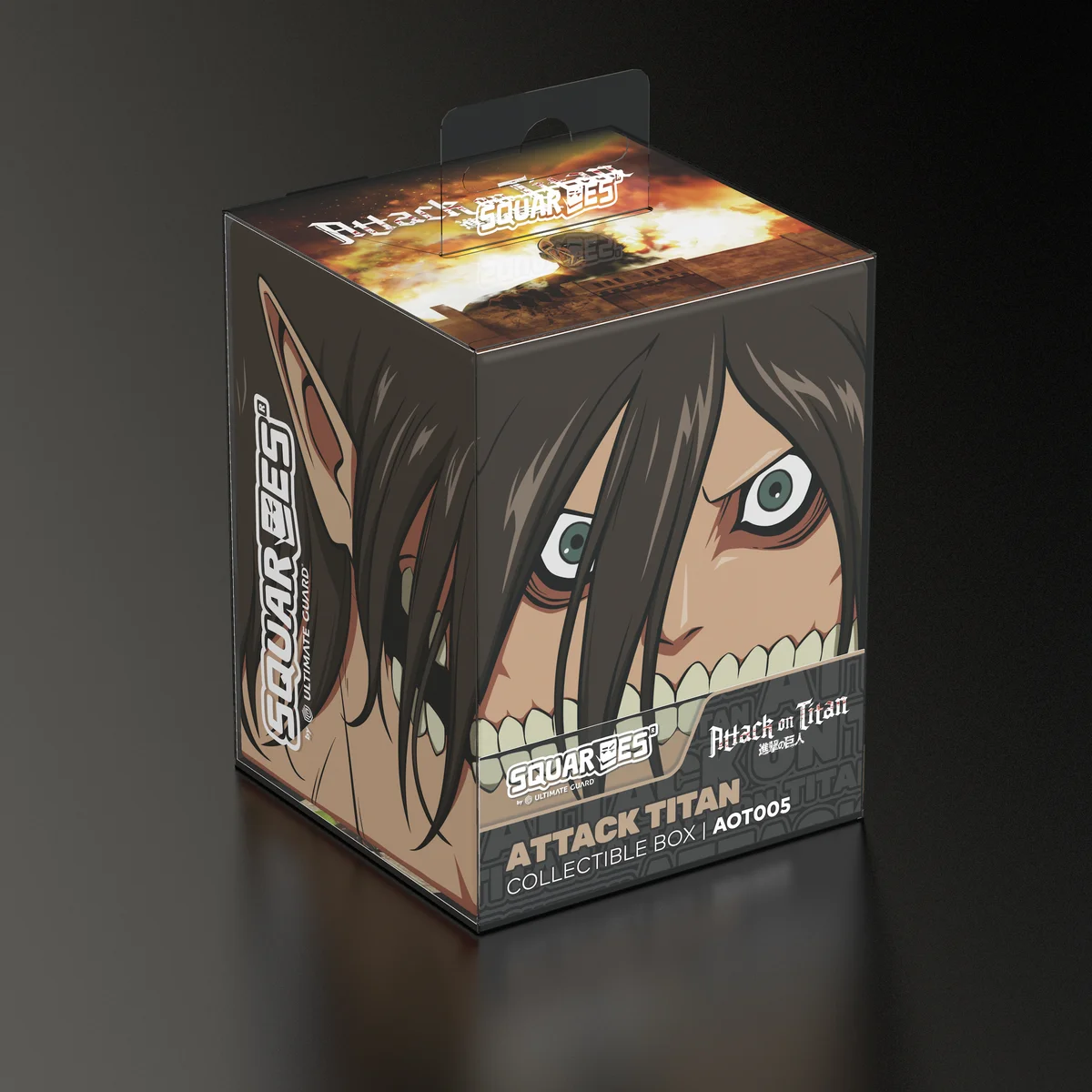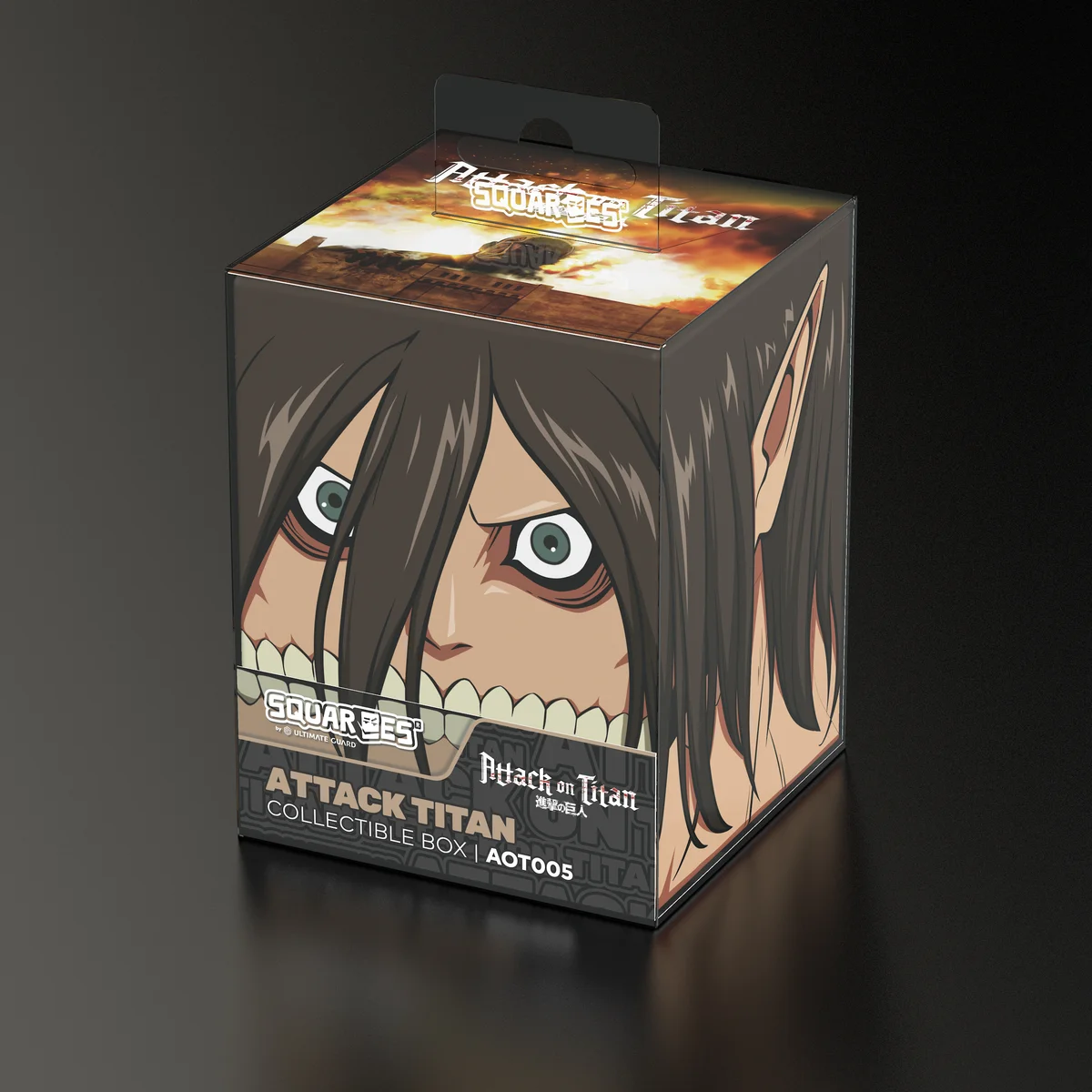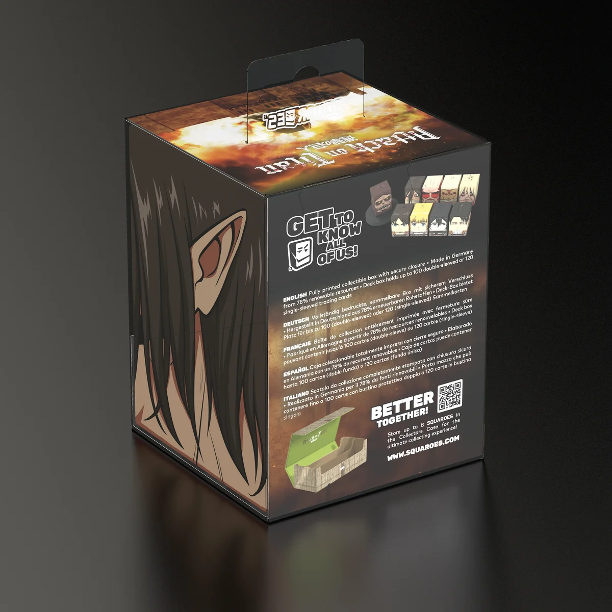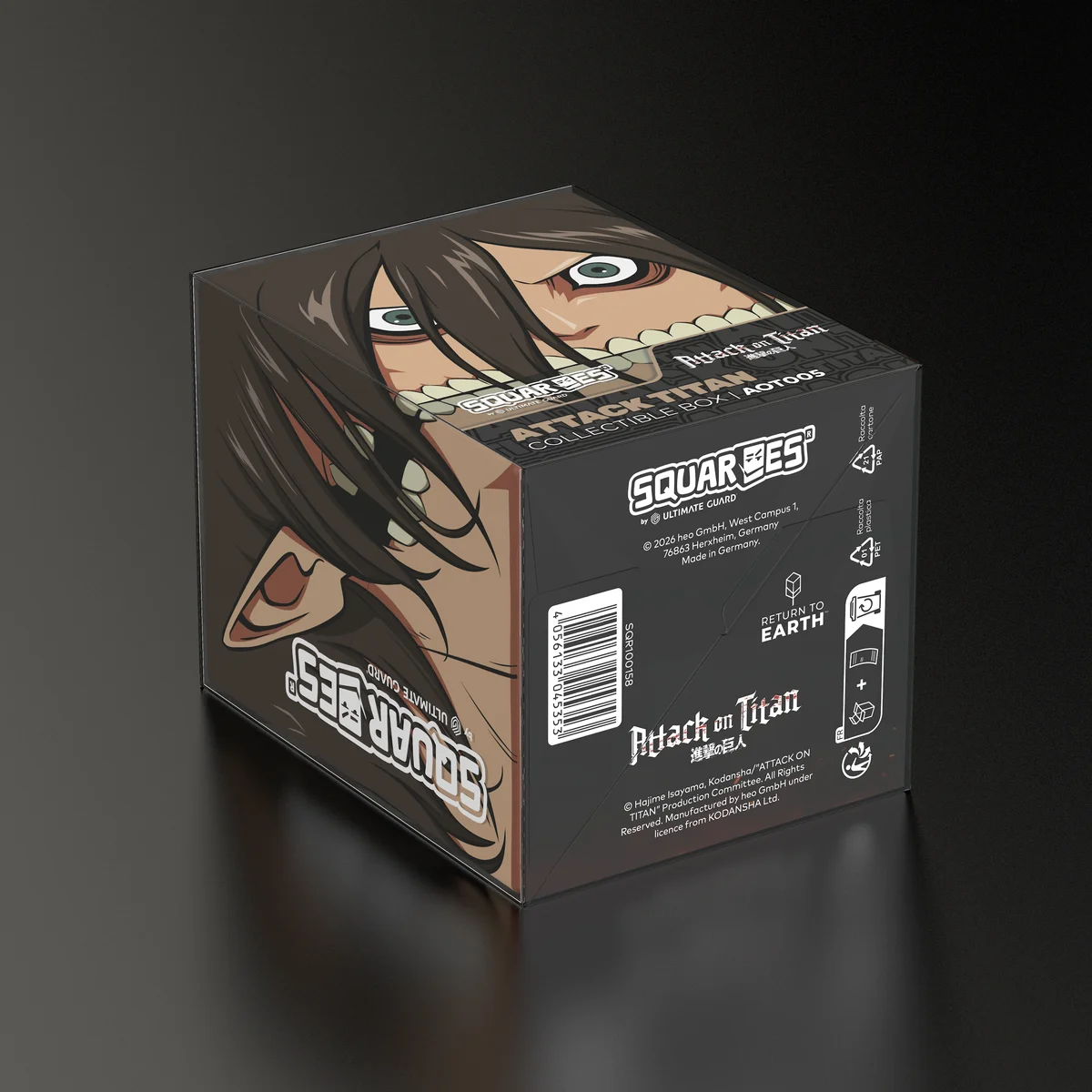 Boîte de collection pour ranger des decks de TCG, des accessoires de jeux de plateau et/ou des objets de collection. Le Attack Titan Squaroe de l'édition Attack on Titan peut contenir jusqu'à 100 cartes en double sleeve lorsqu'il est utilisé comme deck box. Les Squaroes sont fabriqués à partir de 78 % de ressources renouvelables et s'adaptent parfaitement dans le Collectors Case disponible séparément.