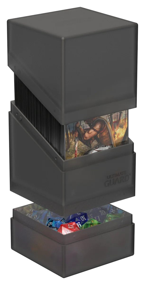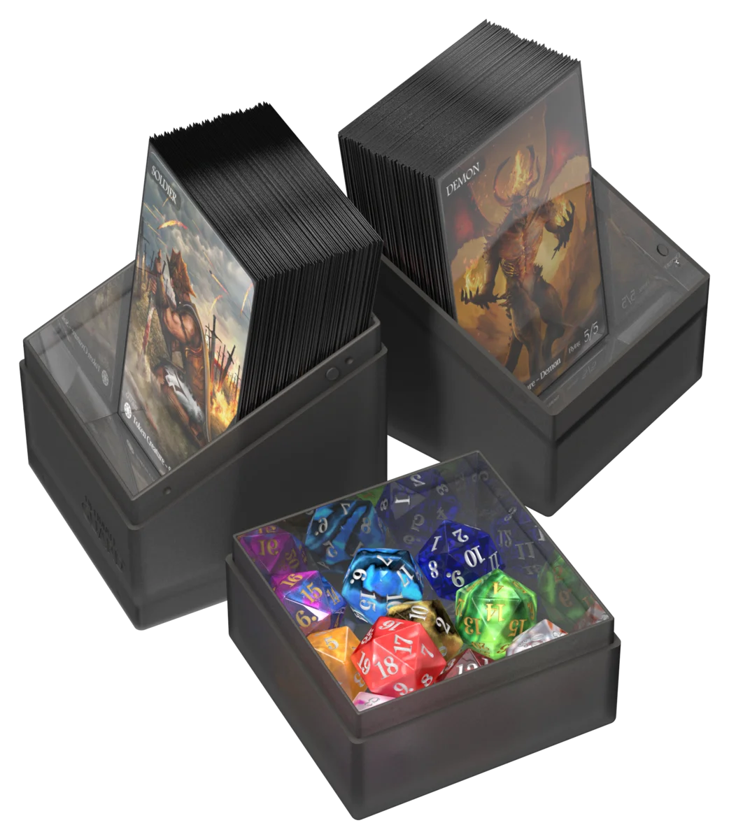 A la demande générale, voici le Boulder'n'Tray 100+. Cette deck case combine la robustesse de notre Boulder avec la flexibilité d'un compartiment supplémentaire pour vos dés et autres accessoires - comme c'était le cas pour notre classique Monolith. Notre Boulder'n'Tray 100+ impressionne par sa finition durable et douce au toucher², qui assure une prise en main confortable et une longue durée de vie pendant toutes vos sessions de jeu.