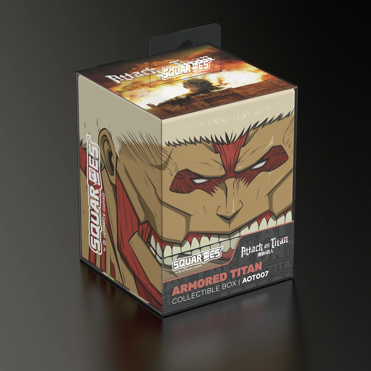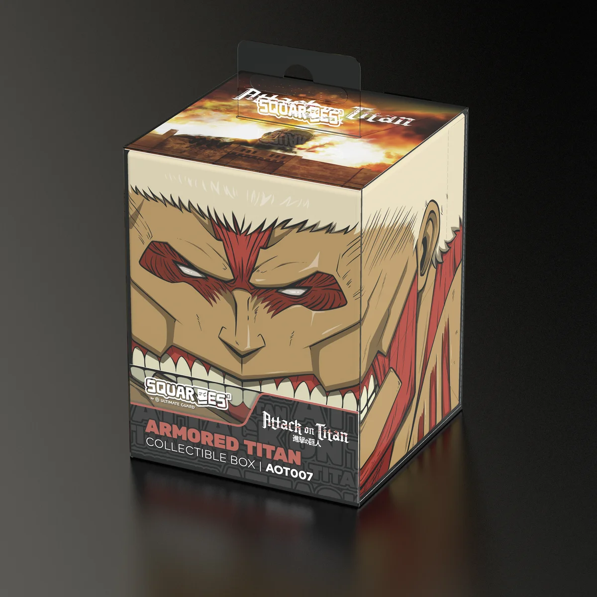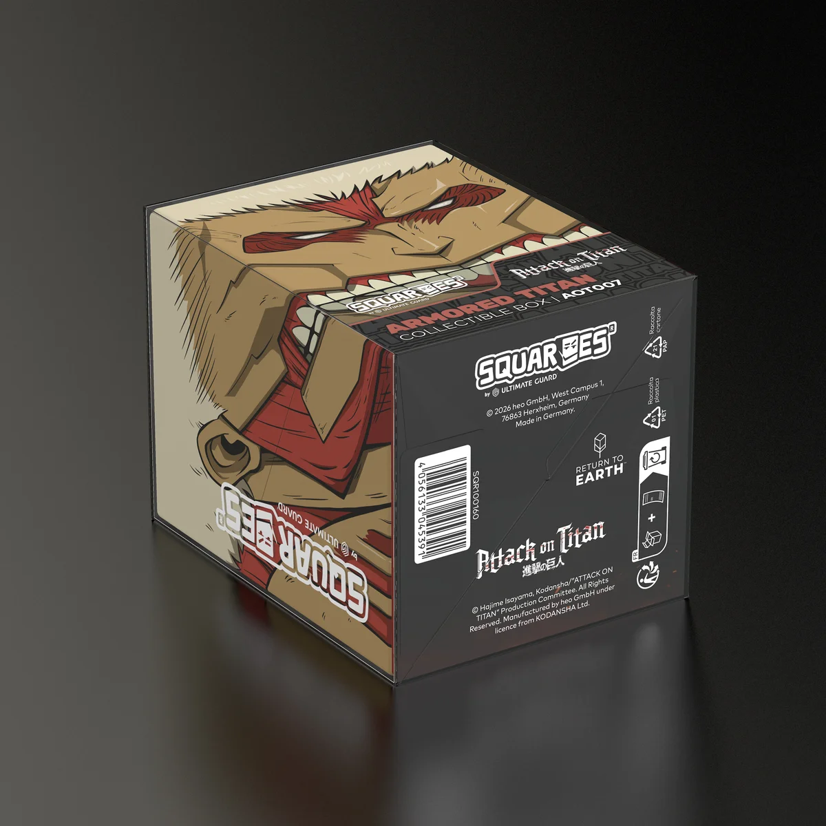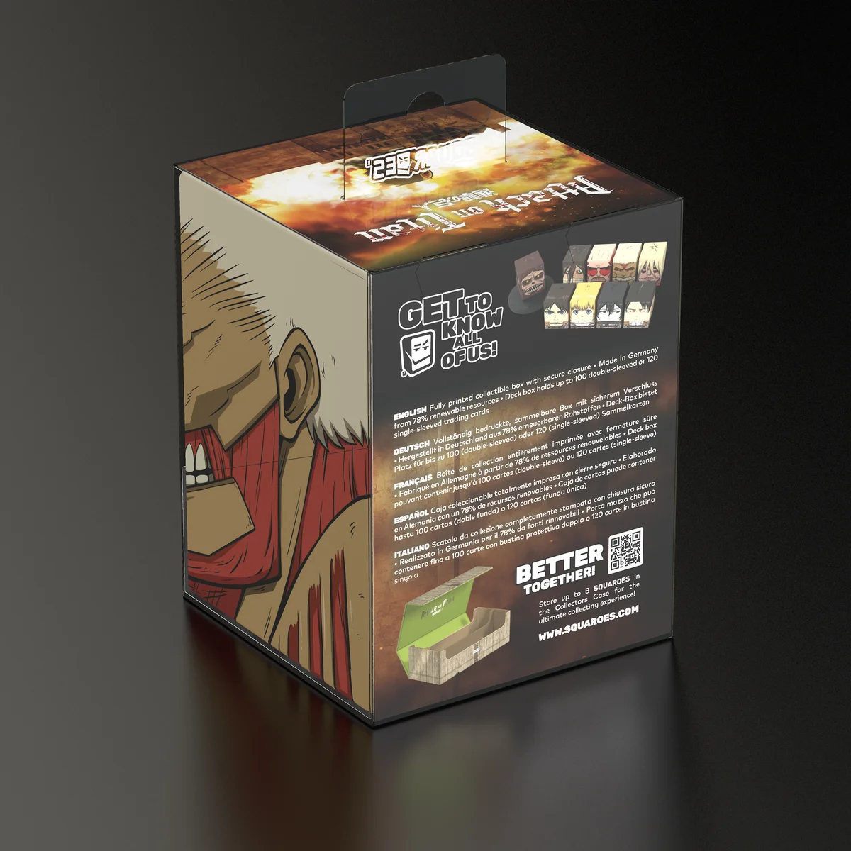 Boîte de collection pour ranger des decks de TCG, des accessoires de jeux de plateau et/ou des objets de collection. Le Armored Titan Squaroe de l'édition Attack on Titan peut contenir jusqu'à 100 cartes en double sleeve lorsqu'il est utilisé comme deck box. Les Squaroes sont fabriqués à partir de 78 % de ressources renouvelables et s'adaptent parfaitement dans le Collectors Case disponible séparément.