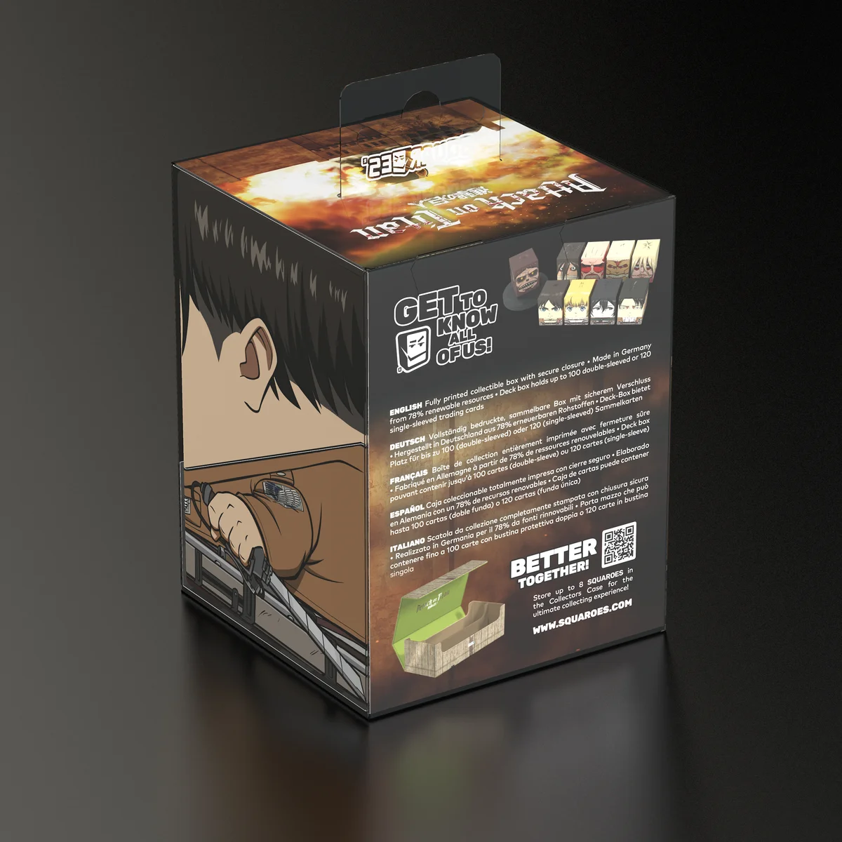 Boîte de collection pour ranger des decks de TCG, des accessoires de jeux de plateau et/ou des objets de collection. Le Levi Ackermann Squaroe de l'édition Attack on Titan peut contenir jusqu'à 100 cartes en double sleeve lorsqu'il est utilisé comme deck box. Les Squaroes sont fabriqués à partir de 78 % de ressources renouvelables et s'adaptent parfaitement dans le Collectors Case disponible séparément.