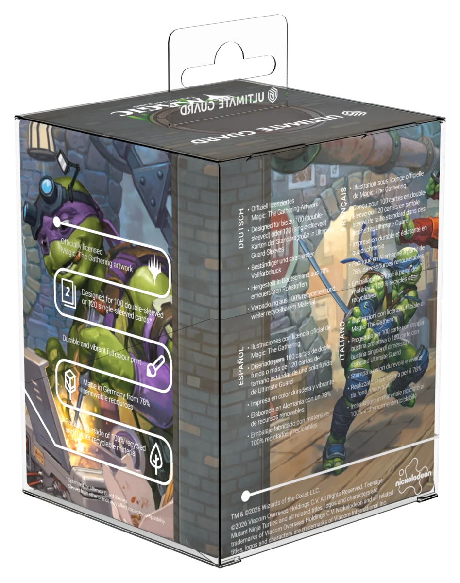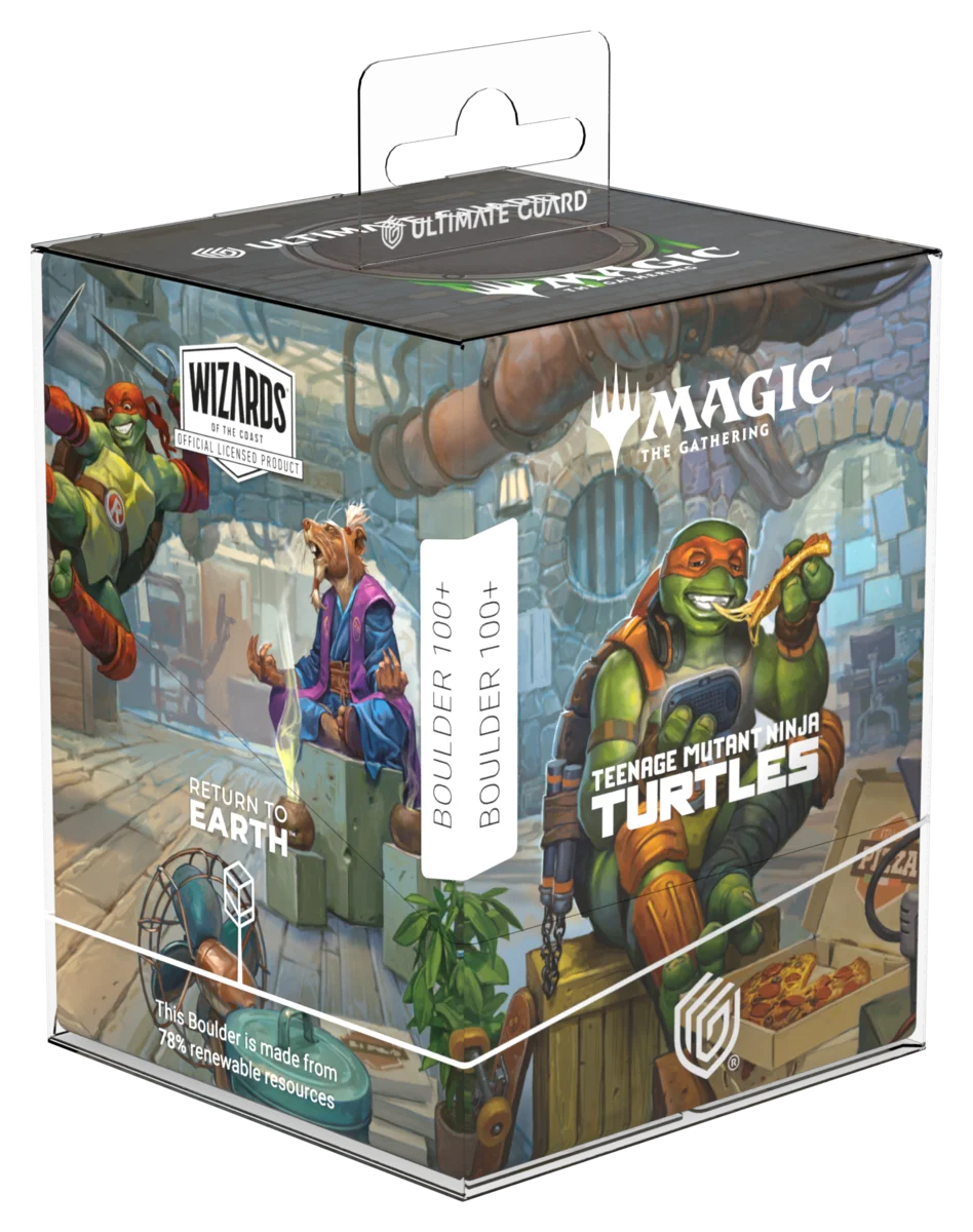 Il RTE Boulder 100+ di Ultimate Guard è un deckbox robusto e affidabile per Magic: The Gathering, prodotto in Germania con il 78% di risorse rinnovabili. Nonostante la chiusura sicura, il RTE Boulder 100+ si apre facilmente e comodamente e può contenere 100 carte con doppia bustina protettiva Ultimate Guard*, rendendolo il deckbox ideale per tutti i formati di Magic (Commander/EDH, Modern, Standard, ecc.). Questo deckbox MTG presenta una stampa vivace a colori con artwork ufficiale dal set "Magic: The Gathering | Teenage Mutant Ninja Turtles" e viene fornito in un imballaggio ecologico realizzato con materiali 100% riciclati e ulteriormente riciclabili. Progettato per combinarsi con tutte le box porta deck grandi di Ultimate Guard, i Boulder si adattano particolarmente bene alle box Arkhive, Superhive e Flip'n'Tray.