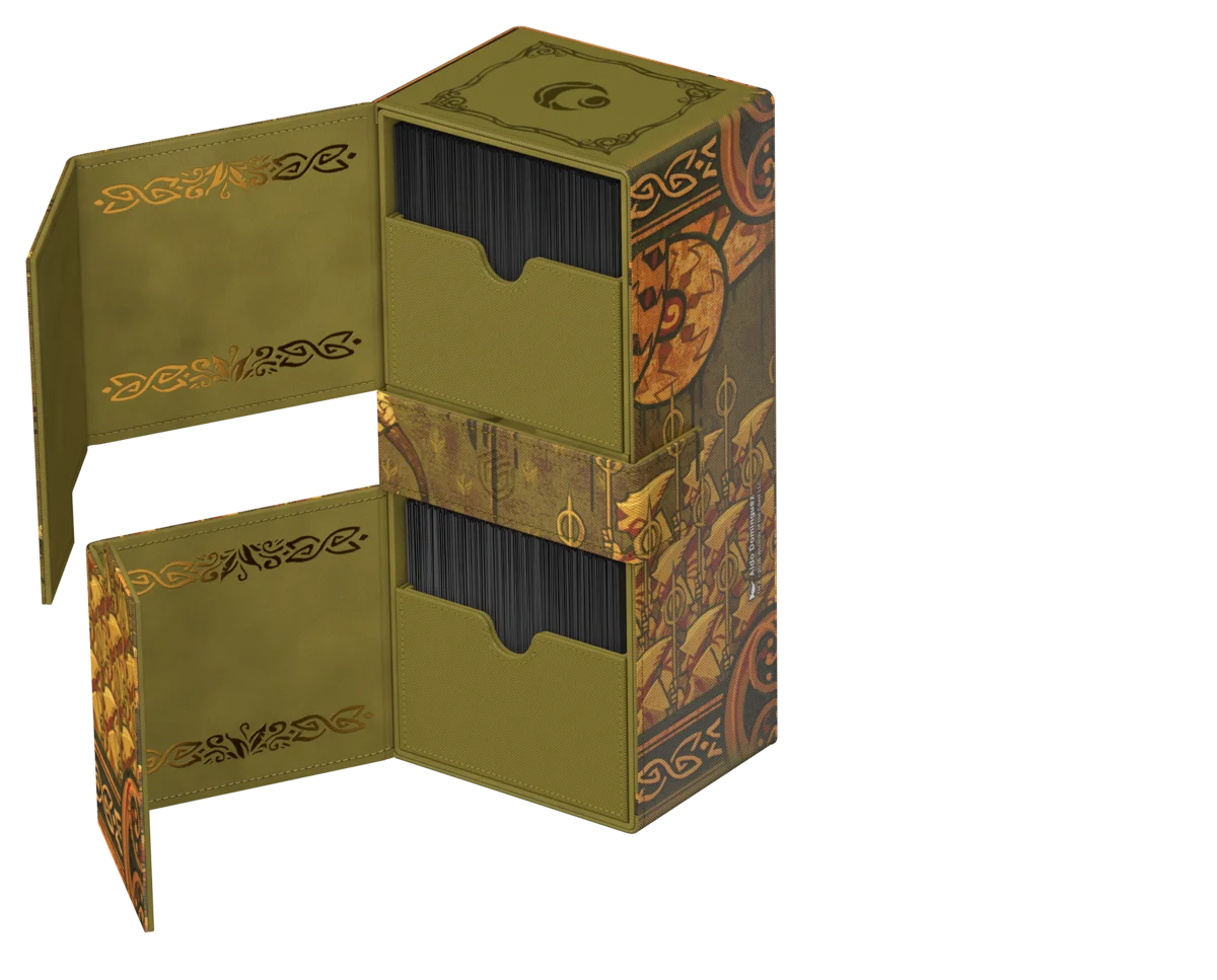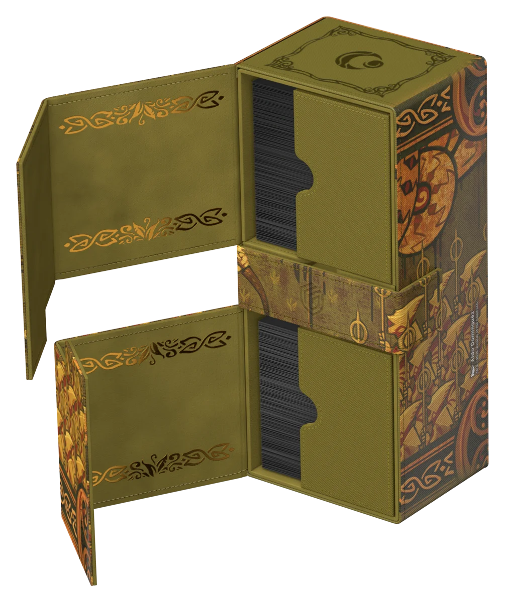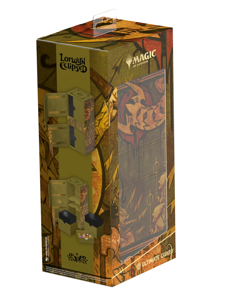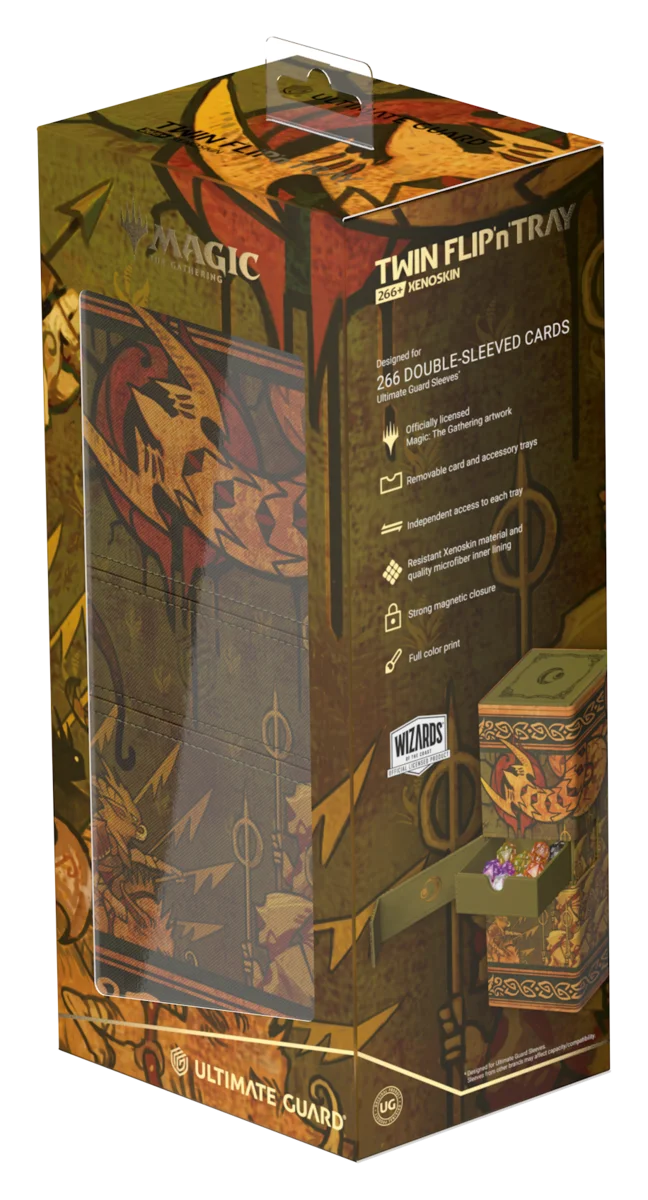 Il Twin Flip'n'Tray 266+ Xenoskin di Ultimate Guard è un deck box premium per MTG con due scomparti indipendenti, ciascuno per 133 carte con doppia bustina protettiva Ultimate Guard*, oltre a un vassoio rimovibile aggiuntivo per dadi e accessori. Perfetto per il formato Commander/EDH di Magic, il Twin Flip'n'Tray è decorato con artwork ufficialmente concessi in licenza dal set "Lorwyn Eclipsed" di Magic: The Gathering e offre spazio extra per ulteriori carte e pedine. Realizzato con la resistente trama Xenoskin, un rivestimento interno in microfibra di alta qualità e forti chiusure magnetiche, garantisce una protezione eccezionale delle carte. Progettato per essere combinato con altri prodotti Ultimate Guard, il Twin Flip'n'Tray può contenere due Boulder 100+ quando i vassoi per le carte vengono rimossi.